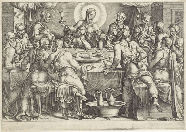 Curator: Looking at this print, I’m struck by the emotional depth achieved through a rather stark medium. There's a palpable humility in the central figure. Editor: Indeed. We're examining Philips Galle’s engraving from 1563, titled “Christ washing the disciples' feet,” housed here at the SMK, the Statens Museum for Kunst. It depicts, of course, a key moment in the Gospel narrative. The tight composition directs your eyes across a panorama of emotions in a relatively confined space, using a scene from the New Testament. Curator: The symbolism is powerful, isn't it? Washing feet was traditionally a task for servants, so Christ’s act here serves as the ultimate gesture of humility and servitude. That's the symbolic cornerstone of the scene. And there's Peter recoiling, a natural, very human reaction to having his superior kneel before him. Editor: Precisely. And it’s fascinating to see how Galle uses this scene to explore themes of power and piety, humility, and social order. Think about the broader context: 16th-century Europe, rife with social hierarchies reinforced by religious doctrine. Art like this wasn’t just illustration; it was actively shaping understanding and acceptance of this order. Curator: The very act of recreating the scene as a print allows the idea to disseminate, too. Imagine how many hands it would pass through, and how it would be received in different homes. The image travels with the message, reinforcing its emotional core, and it still works on us today, centuries later. It makes me wonder if Christ is here prefiguring not just humility, but also sacrifice as a gesture of defiance against worldly powers? Editor: Perhaps. It’s definitely thought-provoking how Galle balances the intimate portrayal of human emotions within this loaded religious context. The question becomes how effectively images challenge or perpetuate authority. Curator: Galle’s composition certainly adds another layer to the iconography. Thanks for highlighting the way this image circulated and evolved through society, especially as its purpose in teaching doctrine has transformed over the years. Editor: Absolutely. It’s these layers that makes examining a single image such a worthwhile cultural journey through time.