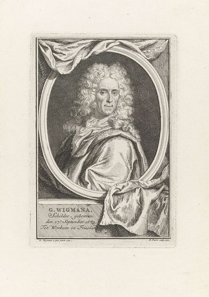 Curator: Here we have a portrait of Frederick I of Prussia, dating from around 1675 to 1711. It's an engraving, so a print, which would have allowed for a wide distribution of this image of the king. Editor: He looks utterly bored! The intricate detail of the armor and the crown can’t hide the weariness in his face. I'd be weary too, wearing a wig that large! Curator: Yes, the scale of production for pieces such as these would rely on a well-structured workshop, and this would certainly speak to his role in the court. Editor: Speaking of roles, this image is pure Baroque theater, projecting power at a time of shifting European alliances. Look at how his hand rests so casually, yet strategically, upon the table near his crown. It’s a power play, signaling his authority while other leaders were fighting for prominence. What statements were meant to be broadcast about leadership? About what he and Prussia stood for? Curator: Indeed. Consider the material realities of disseminating such images. Prints like these became crucial tools for projecting an image of authority throughout Prussia and beyond. How many copies were made? Who distributed them, and to whom? It's a study in the materials of power! Editor: It’s also about the gaze. As a woman looking at this image, I see not just a king, but a constructed performance of masculinity, and, particularly, its effects. The portrait presents an idealized and undoubtedly exclusionary version of a male ruler in 17th and 18th century Prussia. This artwork operates in a long tradition of gendered imagery meant to consolidate patriarchal rule. Who benefitted from the construction of Frederick I in this way? Curator: Thinking about this in the round—and knowing that printmaking involves multiple skilled artisans working to very exacting parameters, all chosen carefully for Frederick’s political ends—the labor involved reflects this society. Where were these craftspeople positioned within this social hierarchy? Editor: And even the choice of the Baroque style, with all its flamboyance, speaks to Frederick’s desire to align himself with a particular vision of royalty. The style and its mass production made political messages readable and reproducible for a large audience. Curator: The intersections of art, labor, and power laid bare! Editor: Exactly! These artworks are complex social and cultural documents. What roles did society enable the construction of and promote in positions of power?