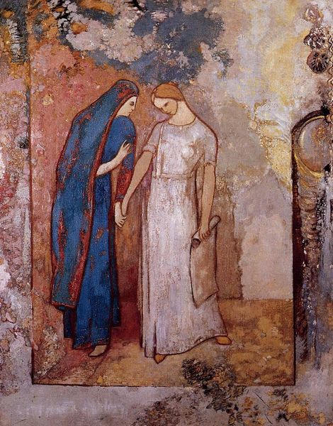 Paul Ranson created this painting, likely in the 1890s, using oil on canvas. At first glance, the scene depicts two figures in draped garments, positioned in a garden setting that is both earthly and otherworldly. The gesture of the outstretched arms is a powerful, recurring motif. One figure extends her hand in a gesture of offering or invitation, and the other reciprocates. The open hand, throughout art history, has signified a myriad of meanings—from supplication and benediction to greeting and farewell. The motif of draped figures harkens back to classical antiquity, yet it finds itself echoed through the Renaissance, Baroque periods, and beyond. These symbols are cultural remnants, each age reinterpreting and reimagining them to fit its own psychological landscape. Note how this scene resonates on a subconscious level, evoking a sense of timeless connection. It's a testament to how motifs and symbols resurface, evolve, and take on new meanings in different eras.
