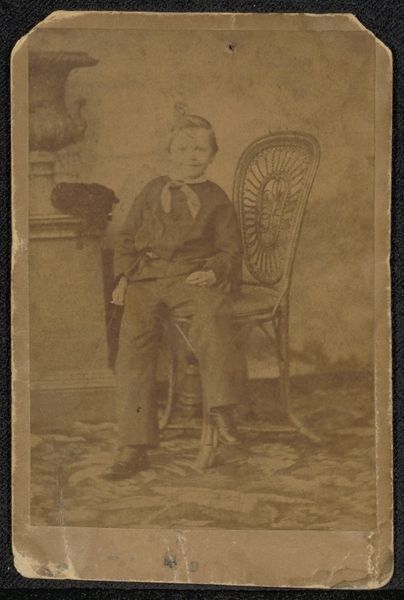 Editor: Here we have an ambrotype from the 1870s, titled *Portrait of an Unknown Boy*. The studio is listed as Kannemans & Zoon. There’s a rather melancholic air to it; the child seems poised but almost world-weary. What symbolic language strikes you in this photographic scene? Curator: Indeed. Notice how the objects surrounding him contribute to that feeling. The ornate chair and footstool, objects designed for comfort and status, paradoxically highlight his unease. They serve as emblems of expectation, a script of gentility he seems compelled to perform. And what does it say that this image was captured as photography began evolving in a Victorian society with children coming more into the spotlight? Editor: So you're saying the photo itself signifies a changing cultural role for children? Curator: Precisely. Early photography like this was frequently about establishing identity. What do you think about the choice to capture children this way? Editor: I suppose I see a parallel with classic paintings: children dressed as small adults in a rigid pose and a staged background. This must represent childhood through the vision of adults and the culture they built. Curator: Absolutely. Consider the symbolic weight of those images and how they continue to influence our perception of childhood, memory and even photography. What are some other connections between symbols from Victorian photography versus modern representations of family? Editor: This makes me consider how much our idea of childhood is constructed, how much of it is imposed by a specific moment. Very thought-provoking! Curator: It is a beautiful visual encoding, isn’t it?