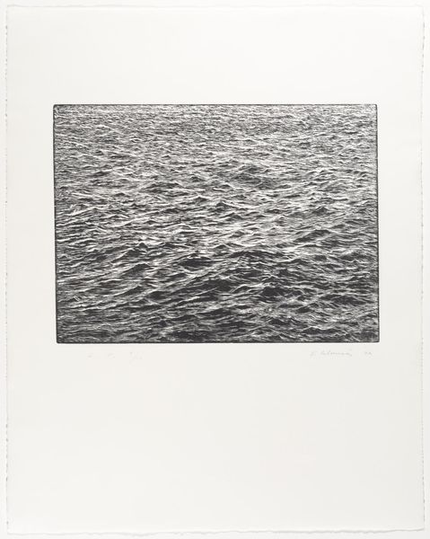Editor: Here we have Vija Celmins' "Ocean Surface Wood Engraving" from 2000. The detail is incredible, it really captures the constant motion of the water. How do you interpret this work, considering its medium and subject? Curator: Celmins' choice of wood engraving, a painstaking process, transforms a seemingly simple subject into a powerful statement about representation. Think about the cultural context – the late 20th century fascination with realism, photographic accuracy. Editor: So, it’s almost a commentary on our need to perfectly capture nature? Curator: Precisely. The politics of imagery here are subtle. It’s a quiet rebellion against spectacle, turning our attention to the overlooked. What do you take away from its monochrome palette? Editor: It feels almost meditative. I appreciate how this work challenges our expectations of both printmaking and landscape art. Curator: Indeed, it’s a reminder that art can be found in the everyday, and that meticulous craft can elevate the mundane.