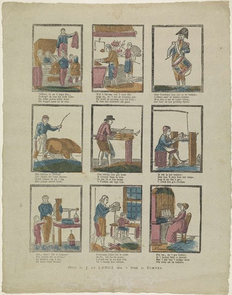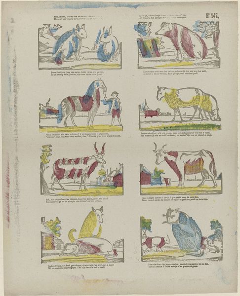 Curator: Here we have a rather intriguing piece, titled "Aanschouwt hier lieve jeugd deze onderscheiden dieren, / Die of in onzen kring of vreemde oorden tieren," which roughly translates to "Behold, dear youth, these distinct animals, who thrive either in our circle or in foreign lands." Created sometime between 1806 and 1858 by Willem Carl Wansleven, this work seems to be an engraving. Editor: Oh, what a delightful menagerie! It’s like stumbling upon a whimsical bestiary. There’s a childlike charm to the naive renderings and the folksy quality that gives it so much warmth, almost like thumbing through a cherished storybook from a bygone era. Curator: Precisely. Consider the socio-political context, these images accompanied didactic verses aimed at young audiences. The images and text instructed children not only about different animal species but also moral lessons. The presentation within these neat little boxes reinforces an idea of order. Editor: That's interesting to know. Though it does feel a bit constricting to confine all those vibrant animals into boxes; perhaps the orderly composition emphasizes a sense of control and domesticity, reflecting the human desire to categorize and comprehend the natural world? Still, you’ve got the noble horse, the steady ox, loyal dogs… Even the lion is defanged by domestication. Curator: The selection itself speaks volumes, does it not? Predominantly farm animals and familiar creatures, those useful or known—along with an aspirational gaze toward the exotic—all serve a distinct societal function. The lion for instance, might also allude to leadership. Editor: Good point, indeed. Perhaps that’s why he’s put in the lower right-hand corner of the panel, a spot of respect for the ‘king’. But I also feel a deeper imaginative undercurrent throughout it, beyond just the educational purpose. It almost whispers to explore a world of curious characters. Curator: Well, yes. Such "genre-painting" had a prominent position within a burgeoning print market during the artist’s lifetime. One cannot disregard market demands alongside intended pedagogical outcomes when analysing these works. Editor: Very true. Seeing all this gives me a hankering to pick up a pen and try to sketch the marvelous things about the animals here! Curator: A sentiment, I suspect, young readers centuries ago felt as well!
