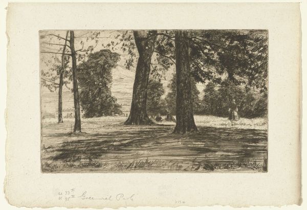 Sir Francis Seymour Haden created this evocative etching of Kensington Gardens in the late nineteenth century. The dominant visual experience is one of depth and texture, achieved through Haden's masterful use of line and shadow. Notice how the composition draws you into the scene, with the trees acting as vertical anchors against the horizontal stretch of the park. The materiality of the etching – the fine lines etched into the metal plate – adds a tactile quality to the image. Haden's technique reflects a broader artistic interest in the aesthetics of printmaking. As an etcher, he emphasized the process itself, allowing the marks of the tool to remain visible. This approach challenges the traditional hierarchy between painting and printmaking. It elevates etching to an art form capable of capturing subtle atmospheric effects. Consider how the dense network of lines creates a sense of depth and spatial complexity. The trees in the foreground are rendered with intricate detail, while those in the distance fade into a hazy background. This interplay of light and shadow is not merely descriptive. It evokes a mood of quiet contemplation. The garden becomes a space for reflection, a theme prevalent in much of nineteenth-century art and literature.