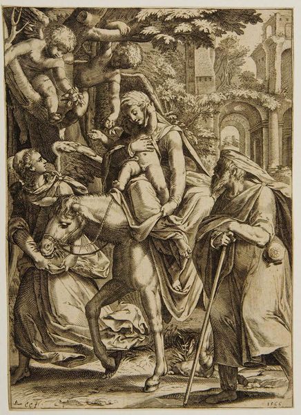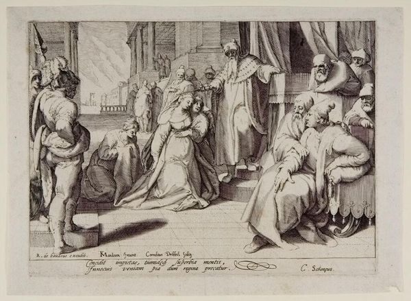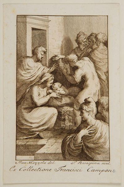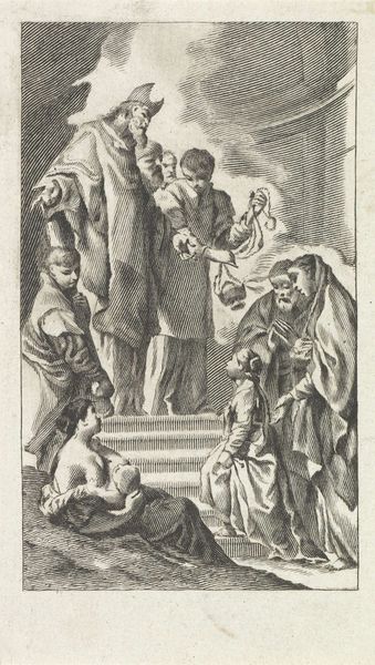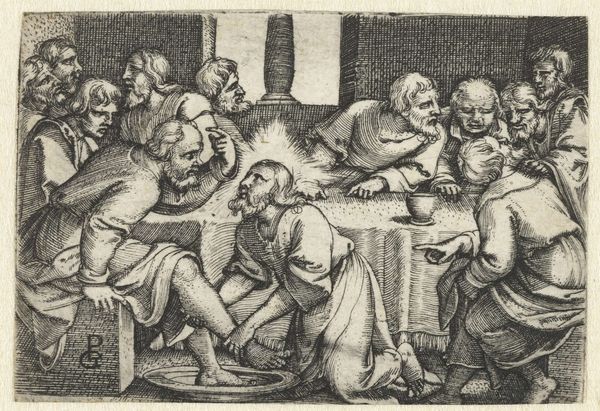 Editor: This is Georg Pencz's "Doubting Thomas", a tiny engraving. It's incredibly detailed, but the mood feels… intense, almost confrontational. What do you see in this piece that I might be missing? Curator: Oh, it's a drama in miniature, isn't it? I see faith wrestling with reason, that eternal dance. Pencz captures the very moment of conversion, Thomas's world shifting on its axis as he touches the wound. It’s about the tangible overcoming the theoretical, like poetry etched on a pinhead. Editor: So the small scale heightens the emotional intensity? Curator: Precisely! It's a concentrated dose of spiritual revelation. Think of it: Pencz, living through the Reformation, crafting this image of belief made visible. It’s not just a story; it's an argument, whispered in ink. Editor: Wow, I hadn't thought about it that way. It really gives you a lot to think about. Thanks for the insight.