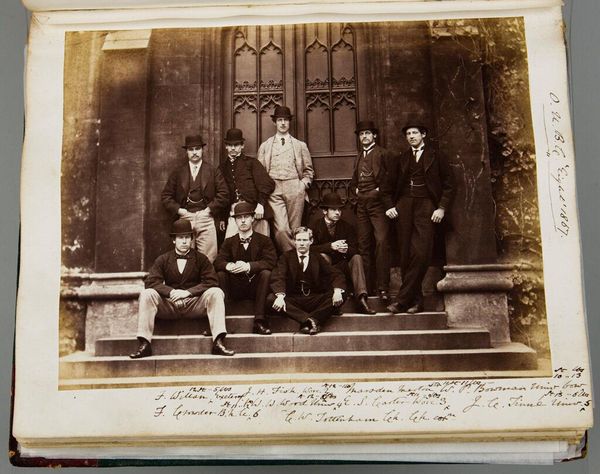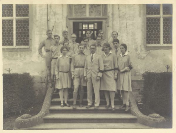 Editor: This photograph, "Defectives, Epileptics: United States. Massachusetts. Palmer. State Hospital for Epileptics: Group of Male Nurses and Dr. Cooper 1906," is by Woodhead Studio. It's quite striking. The figures are so formally arranged, and the texture of the stone wall creates a strong backdrop. What do you see in the composition? Curator: The stark linearity is compelling. Note how the horizontal lines of the brickwork bisect the verticality of the figures. This creates a rigid, almost oppressive structure. The tonal range is limited, heightening the sense of constraint and order. Editor: So you're seeing the formal elements creating a sense of rigidity? Curator: Precisely. The composition denies any sense of dynamism, trapping the figures within the frame. The limited tonal range further contributes to this feeling of confinement. Is that also your impression? Editor: I hadn't thought about the tonal range so deliberately, but I see how it reinforces that feeling. Curator: The photographer's control of these elements shapes a powerful statement.