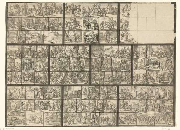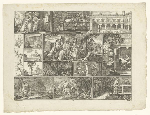 Romeyn de Hooghe created this intriguing sheet of illustrations of a juridical nature. The artwork presents a series of small, detailed scenes arranged in a grid-like composition. Each panel captures a different legal or judicial scenario, rendered with the fine, precise lines characteristic of engraving. The stark contrast between the dark lines and the light paper creates a visually striking effect, drawing the viewer's eye into each individual narrative. The use of emblematic figures and symbolic elements, such as scales, swords, and allegorical figures, enriches each scene with layers of meaning. De Hooghe employs a semiotic system to comment on themes of justice, power, and morality. This echoes the contemporary philosophical interest in the underlying structures of law and society. The layout encourages us to decode these visual cues, challenging us to interpret the complex relationships between the images and their cultural context. The artist doesn't offer fixed meanings, allowing for multiple interpretations and reflecting a modern sensibility towards the fluid nature of truth and representation.