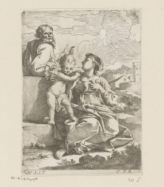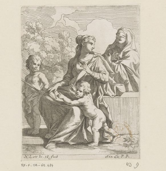 Editor: This is "Maria met kind en lam," or "Mary with Child and Lamb," by Sebastien Bourdon, dating from 1626 to 1657. It's a delicate print, an engraving. The lamb gives the piece a pastoral feel. What do you see in this work? Curator: This image offers a fascinating insight into the public role of religious imagery in the 17th century. While seemingly simple, Bourdon's work engages with a rich visual and theological tradition. Prints like this circulated widely, making religious narratives accessible beyond the Church walls. Note the staged scene. It's both intimate, with Mary and the Christ Child, but also consciously crafted for a public audience, framed like a theatrical production. Editor: The "theatrical production" element makes sense. It feels staged, doesn’t it? Curator: Absolutely. And consider the inclusion of the lamb. It’s a traditional symbol of Christ's sacrifice, linking Mary's tenderness with a future tragedy. Do you think this image challenges or reinforces existing power structures of its time? Editor: That's interesting! Given its religious subject, it probably reinforced them? The church and monarchy held much sway then, didn't they? Curator: Yes, but it’s important to note the shift towards more personal and domestic portrayals of religious figures during that period. This print, because it could be mass-produced and circulated, may have helped foster a more personal relationship with faith, slightly destabilizing the church's sole control over spiritual life. It subtly democratized access. Editor: That's a perspective I hadn’t considered – how wider distribution of images, regardless of subject, influences power dynamics. Thanks! Curator: Precisely! It highlights how art serves as a tool for shaping beliefs. And considering Bourdon, it adds more to what the piece could say at that period in time. Editor: I appreciate you broadening my understanding.