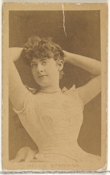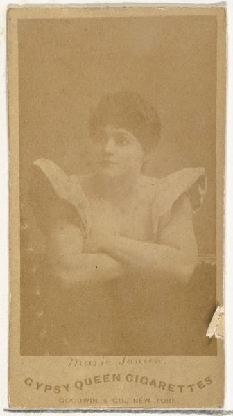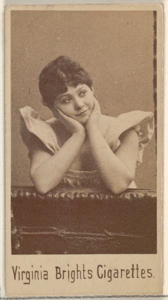 Editor: Here we have a portrait from the "Actors and Actresses" series, specifically N45, Type 4, produced between 1885 and 1891 by Allen & Ginter for Virginia Brights Cigarettes. It's a sepia-toned print of a woman, likely an actress of the time. It’s intriguing how this intimate portrait is being used to sell cigarettes! What can you tell me about the historical context here? Curator: Absolutely. These cards were indeed used as marketing tools, tucked inside cigarette packs. We must consider the gaze here. Who is this portrait intended for, and what's the message? It reflects a time of nascent consumerism where women's images were powerfully associated with products, subtly promoting aspirations of glamour, beauty and social status alongside the purchase of cigarettes. Consider also the power dynamics at play: The commodification of the actress' image, and its potential effect on women in the workforce, not necessarily on stage, whose physical appearance would become more strictly policed. How do you see that working here? Editor: I guess the implication is that if you smoke these cigarettes, you too can associate with this kind of glamour and elegance. Do you see this as a proto-feminist or anti-feminist gesture? Curator: It's complicated. The actress, as a working woman, achieved a certain independence. However, her image is exploited within a patriarchal structure for profit. It becomes both an endorsement of a woman’s visibility but only when that visibility sells something. How does this compare to advertising of today? Editor: That's fascinating – a double-edged sword then. So, on the one hand, there's visibility and possibly a measure of agency, but within limits dictated by consumerism and gendered expectations. Looking at advertising today, it's clear we still grapple with similar issues. Curator: Precisely. Understanding the nuanced historical contexts can shed light on the complexities of representation, power, and gender, and how they continue to inform contemporary media.