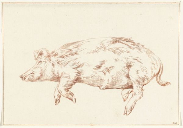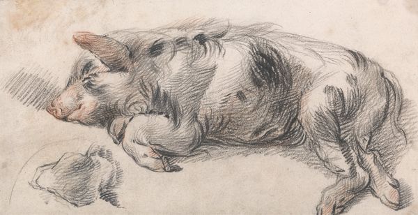 Editor: This is "Liggend varken," or "Reclining Pig," a drawing in pencil and charcoal by Hendrik Willem Schweickhardt, dating from between 1756 and 1797. It's surprisingly endearing; the pig looks so peaceful. What do you see in this piece? Curator: I see a powerful statement about the representation of animals, particularly within the context of the 18th century. Schweickhardt isn't just depicting livestock; he's inviting us to consider the inherent worth and dignity of a creature often reduced to its utility. How does this portrayal challenge the dominant anthropocentric worldview of the time, and even our own? Editor: That's an interesting perspective! I hadn't thought of it as a challenge to anthropocentrism. I was just focused on how cute the pig is! Curator: "Cute" is a valid reaction, but it also offers an entry point. Consider how societal structures dictate what is considered "cute" and worthy of our affection. Often, animals are only granted consideration if they appeal to human sensibilities. What does it mean, then, to find beauty or "cuteness" in something like this pig, historically viewed through the lens of agriculture and sustenance? Editor: So, you’re saying the drawing could be interpreted as a subtle form of activism, suggesting a re-evaluation of our relationship with animals? Curator: Precisely! It encourages a dialogue about empathy, ethics, and our responsibility towards non-human life. We must ask ourselves if such images can help us to recognize our interconnectedness with all beings. Is art’s role to make these arguments on their own or instigate further arguments? Editor: That's a lot to consider. I’ll definitely be looking at animal portraits differently now. Thanks for opening my eyes! Curator: And thank you for yours; your observation about its endearing quality reminds us of the simple connections art can create.