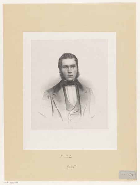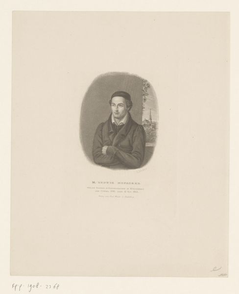 Editor: This is a print titled "Portret van Domenico Artaria" by Ludwig Emil Grimm, made sometime between 1815 and 1863. It's done with ink on paper. It strikes me as rather formal, almost severe, but I'm curious, what do you see in this piece? Curator: The first thing that catches my eye is the book Artaria holds. The book symbolizes knowledge, wisdom, and perhaps, the subject's contribution to the intellectual life of his time. Notice how he holds it, almost possessively. Does that suggest anything about his status or perhaps even anxieties related to legacy and influence? Editor: I hadn't considered the book like that. More than a prop, it seems a conscious statement about identity. Do the subject's clothes also have symbolic weight? Curator: Absolutely. His clothing is of the era but in simple colors, signaling his social standing but, again, the absence of lavishness might speak to deeper societal shifts. What message would it convey? Think of how social mobility evolved over time through outward symbolic expression, Editor: Maybe a turn towards valuing intellect and hard work, rather than just birthright? It seems less overtly opulent and formal compared to portraits of aristocracy I've seen. Curator: Precisely! And note the gaze: direct and almost challenging. This would connect to ideas concerning meritocracy of Romanticism, and new ways of thinking about class and what constitutes significance, far from that era's traditional visual cues. Editor: I see! Now I am thinking how different messages are conveyed subtly through carefully placed symbols, influencing not just aesthetics but historical narratives, too. Curator: Yes! It is fascinating to consider how symbols morph in meaning while enduring across generations!