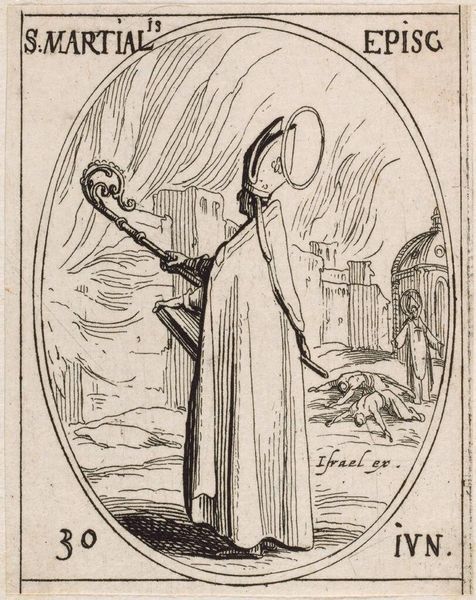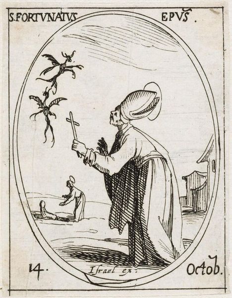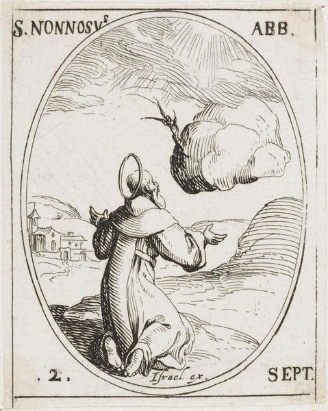 Curator: Look at this captivating etching, Saint Anthony Abbot, by Jacques Callot. It's small, just 7.6 by 4.9 cm, but teeming with activity. Editor: It feels like a nightmare distilled into a postage stamp! The saint seems remarkably unfazed by the sheer chaos around him. Curator: Exactly! Callot’s skill in etching allowed for incredibly detailed depictions of the torments—demons, monsters—that Anthony faced in the desert. Consider the socio-economic context: prints like these were widely disseminated, making religious narratives accessible to a broad audience. Editor: I'm struck by the contrast. The delicate lines create these grotesque creatures, but also a sense of, dare I say, playfulness? It’s like a macabre dance. Curator: The process of etching itself, the acid biting into the metal, mirrors the trials Anthony endured. It speaks to resilience, perhaps even a bit of alchemical transformation. Editor: It makes you wonder about Callot's own demons, doesn’t it? What inner landscapes fueled such a fantastical vision? Curator: Indeed. This tiny print offers us a glimpse into a world where faith and fear are inextricably linked through artistic production. Editor: A potent reminder that even in the darkest corners, there's room for a little artistic flourish.