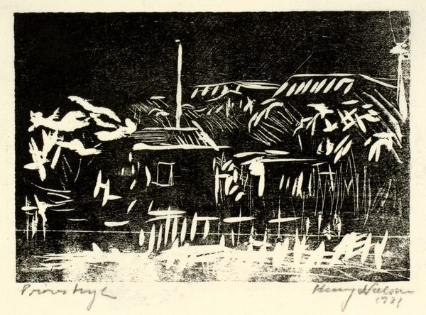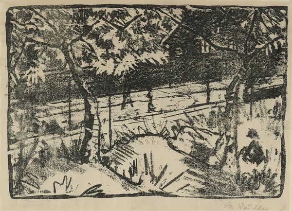 Curator: Looking at "Train Station," a 1913 woodcut print by Werner Gothein, the eye is immediately drawn to the interplay of harsh black and white. Editor: It strikes me as melancholic. The rigid geometry mixed with those figures seems to isolate them, lost amidst a modern urban landscape. The rough texture accentuates this sense of alienation. Curator: Absolutely. The stark contrasts in this Expressionist piece tap into anxieties about modernization, which really dominated social discourse in early 20th-century Germany. Consider the political context: Industrialization altered social and familial structures irrevocably, destabilizing gender roles and labor expectations, particularly after mass conscription for military and industrial labour changed societal and political attitudes toward women and workers in general. Editor: The vertical lines forming the station pillars create this rhythm. It also gives off this somber, almost oppressive visual of columns and pillars from classical architecture or cathedrals of that era, representing permanence and rigid structure, clashing against this dynamic modern force of transport and rapid change. Curator: Yes, that tension is palpable. What seems like an exciting new opportunity for increased mobility became, for some, a heavy visual marker of cultural destabilization and psychological fragmentation of self within the modern city. Those abstracted figures look rather defeated within it, like they're waiting for someone to return who has been taken by industry or war. Editor: Exactly. The limited tonal range makes it intensely graphic, forcing us to see the raw construction, and by extension, question progress at the dawn of technological boom. In an era of heightened symbolic importance of travel by rail, like war-time trains, this is a potent symbol. Curator: That reading layers additional narratives: anxieties about German militarization prior to WWI; and the loss and grief attached to that political upheaval as more young men departed for the fronts. This image presents us with the complexities of change, experienced individually and collectively. Editor: Gothein masterfully captured not just a place, but a cultural mood, an ambivalent relationship with modernization through enduring symbols of society, trauma and collective social progress. Curator: Ultimately, "Train Station" stands as a vital Expressionist work to reflect the unease percolating beneath Germany’s social fabric. Editor: A disquiet that, poignantly, resonates still.