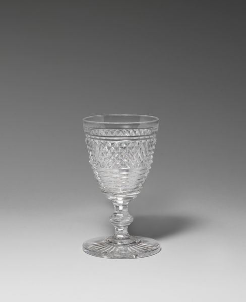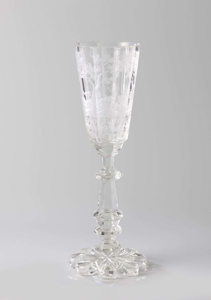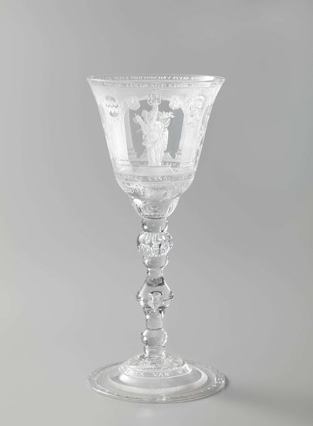 Editor: Here we have a "Bokaal met een band met asymmetrisch bladwerk, waartussen een beren- en een hertenjacht," or Goblet with a band of asymmetrical foliage, depicting a bear and deer hunt, dating from around 1725 to 1750. It's an engraved glass piece by an anonymous artist. It strikes me as incredibly detailed for such a delicate medium. What do you see in it? Curator: The glass is clearly Baroque; observe the intricate design, the elegant curves in its overall form, and its decorative approach, all features consistent with the stylistic movement. Notice how the engraver created layers and depth by varying the density of their marks, offering a multi-dimensional image despite working on a two-dimensional surface. It also reveals a studied contrast of light and shadow that accentuates the scenes depicted. The form of the goblet itself, with its flaring bowl and faceted stem, contributes significantly to its overall aesthetic appeal, creating a satisfying structural rhythm. Editor: That's fascinating. I hadn't thought about the light and shadow play as a deliberate technique, but it really makes the hunting scenes pop. Curator: Indeed, and note also the meticulous application of minute decorative details. The very medium lends itself well to such displays of skill, precision, and control. We see, through observation of material and composition, what artistic values were held at this historical moment. Editor: So it's the careful balance of form and decoration, not just the hunting scenes themselves, that make it significant. Curator: Precisely. By isolating and analyzing the various compositional elements, we unlock deeper insight into this piece. Editor: I never would have thought to look at a drinking glass in quite this way. Thanks for pointing out the importance of visual analysis here! Curator: My pleasure. There's much to see when we learn to look beyond the immediately visible subject matter.