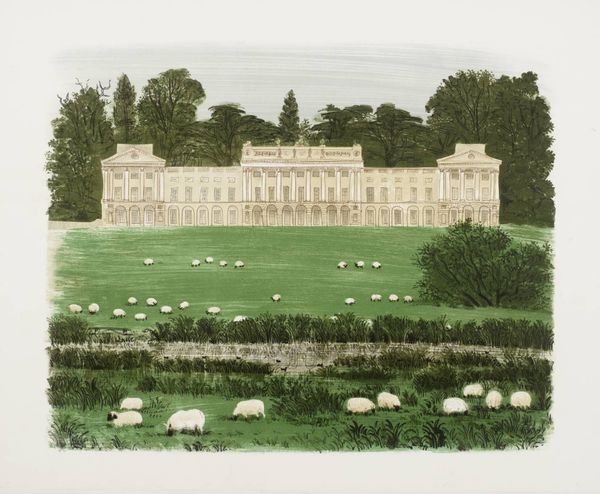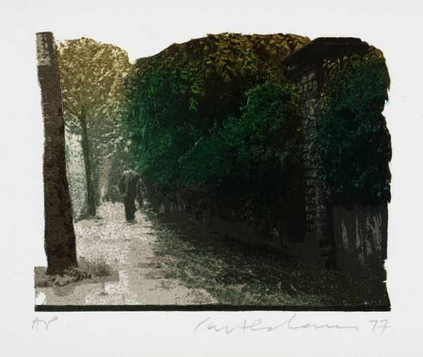 Editor: Here we have Ivor Abrahams’ "Pathways I," the date is unknown, but it's part of the Tate collection. I’m struck by the almost artificial neatness of the garden. What’s your take on this piece? Curator: It's interesting you mention artificiality. Abrahams, working in the 70s, was deeply engaged with critiquing idealized suburban landscapes. This manicured garden, rendered in print, speaks to control and perhaps even repression within British society. How does the gate figure into that reading for you? Editor: Well, it's an entry point, but also a barrier... a symbol of privilege, perhaps? Curator: Precisely. And the elevated vantage point reinforces a sense of detached observation, hinting at the artist's critical perspective. It makes you consider who this space is really for, doesn't it? Editor: Definitely gives me a lot to think about in terms of social commentary. Curator: Indeed. Art is rarely just about aesthetics; it's often a mirror reflecting societal values and power structures.