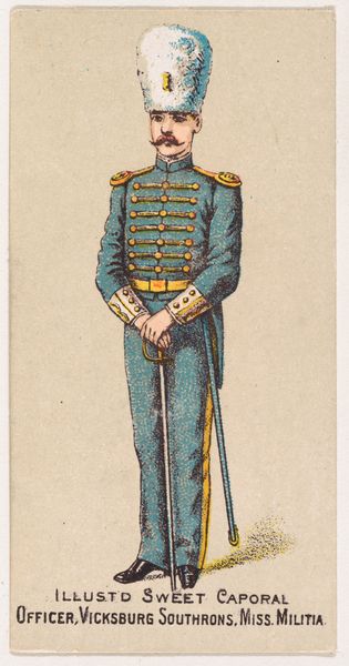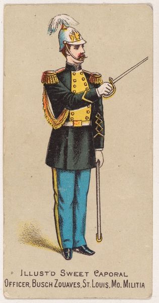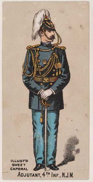 Editor: Here we have a print from 1888, “Captain of Cavalry, United States Army, 1886, from the Military Series,” issued by Kinney Tobacco Company. It's a drawing or print, seemingly made to promote Sweet Caporal Cigarettes. The captain’s uniform is so detailed, but his expression feels almost…distant. What’s your take on this work, particularly its role as a commercial object? Curator: Well, that's an insightful starting point. Consider the context. These trade cards emerged during a period of burgeoning industrial capitalism and expansionist nationalism. The ‘heroic’ military figure became a popular advertising symbol, subtly linking products to ideas of national strength and virility. Editor: So, the cigarette company is capitalizing on… militarism? Curator: Precisely. It's not just about selling tobacco; it's about aligning the brand with an image of power, authority, and the romance of the military. Think about how the meticulous detail you mentioned—the braided cords, the elaborate hat— contributes to this sense of spectacle. This image helped to shape the *idea* of the military in the public imagination. It is also highly sanitized of the violence inherent within the occupation and the many battles that took place with Indigenous communities. Editor: It seems strange to think of art being used this way… as essentially propaganda. Curator: The public role of art is complex and can be used as a tool for promotion and control. In that sense, these cards weren't necessarily intended to be high art. How effective do you think such imagery was in shaping public opinion? Editor: It's a clever tactic and is still happening now. I suppose I never thought about it this deeply! Thanks for your time and insights! Curator: My pleasure, your interest is refreshing, especially considering the historical weight within even these smaller artistic pieces.