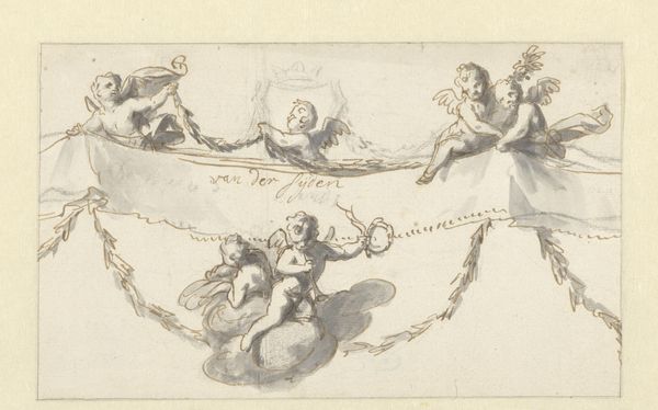 Jan de Lairesse made this drawing of five putti with a banderol sometime between 1673 and 1716, using pen and brown ink, and brush in gray. The monochrome palette here is particularly interesting. It almost anticipates photography, giving the work a mechanical feel, despite the freehand drawing. Lairesse’s use of these materials speaks to a transition in the art world, where the rise of printmaking and reproductive technologies began to influence even unique works on paper. It is no longer simply about the artist's hand, but also about the potential for dissemination and mass consumption. It’s tempting to think about this drawing in relation to the industrial revolution, which was just around the corner at the time. Lairesse was clearly thinking about the market for his work, and how it could be multiplied and distributed. It marks a shift in the status of the artwork, from a unique object to a repeatable commodity.