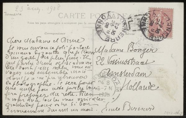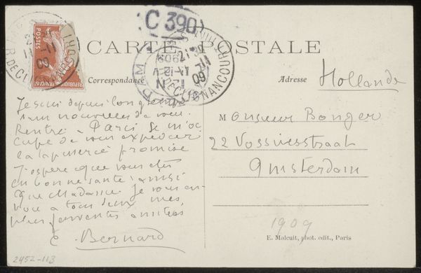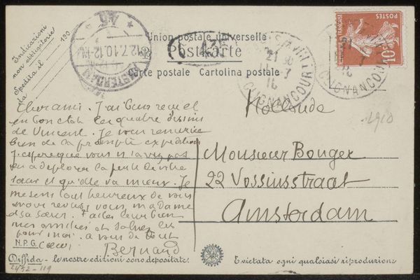 Editor: Here we have "Prentbriefkaart aan Andries Bonger," a pre-1908 drawing by Émile Bernard, rendered in ink on paper. What immediately grabs me is the juxtaposition of the sender’s beautifully looping cursive with the structured, almost grid-like, layout demanded by a postcard. It's a study in contrasts, almost a conversation between form and function. What do you see when you look at this? Curator: Intriguing observation. Initially, I'm struck by the relationship between text and image. The handwriting itself becomes a dominant visual element. The flourishes and varied line weights possess an expressive quality independent of their semantic content. Note how Bernard uses the constraints of the postcard format – the pre-printed lines, the reserved space for address and stamp – as a framework upon which to build his composition. It's almost a rebellion against the expected uniformity. Consider the tension created by the density of the written message versus the relative emptiness of the address field. Do you perceive a similar push-and-pull? Editor: I do. The handwriting seems to be pushing against the borders, especially on the correspondence section of the postcard. Do you think that tension might have meaning beyond just the visual arrangement of the piece? Curator: Certainly. The energy contained within those boundaries, both visual and textual, suggests a restless spirit perhaps, eager to communicate, but constrained by distance and formality. Note the carefully chosen words of the Post-Impressionist Bernard: we also might examine how these elements interact—and what happens when those lines begin to blur? Editor: That is helpful in framing it all within the artistic landscape. It’s fascinating to think about how an everyday object like a postcard can be such a compelling work. Curator: Indeed. And that’s the power of close observation, isn't it? We begin to see the inherent aesthetic qualities even within the most utilitarian forms.