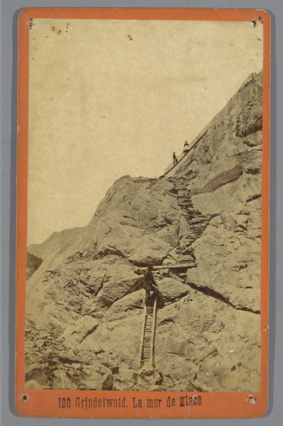 This photograph, "Bergbeklimmers in Chamonix," was taken by Auguste Garcin. It captures a steep, imposing mountain face. The sepia tones lend a timeless quality, emphasizing texture and form, rather than vibrant color. The composition is dominated by the diagonal thrust of the mountain, which fills most of the frame. This design creates a sense of instability but also draws the eye upwards, mimicking the climbers' ascent. We notice the climbers as small figures against the immensity of the rock. The texture of the mountain is rendered in great detail with the variations in light and shadow. These visual cues contribute to the feeling of ruggedness. This image destabilizes traditional landscape photography. Instead of a panoramic view, we are confronted with a sheer verticality. This disrupts our sense of scale and perspective. The photograph challenges our perception. The mountain looms, suggesting not just a physical challenge but perhaps also an existential one. The photograph serves not merely as a record but as an exploration of form, scale, and human endeavor against the backdrop of nature's grandeur. It offers us a space for ongoing interpretation, prompting us to question our place within the natural world.