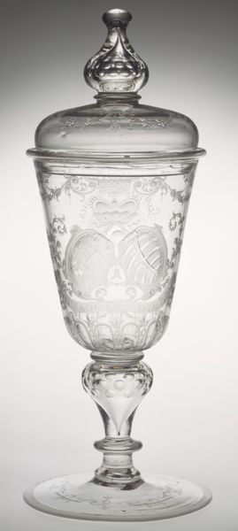 Editor: Here we have a beautiful example of decorative art, a standing cup with a cover, made of glass sculpture around 1715-1725, by G.E. Kunckel. I'm immediately drawn to the delicacy of the glasswork; it feels incredibly fragile and precious. What symbols do you see within the design? Curator: Well, I'm fascinated by how objects like this embody cultural memory. Glass, even in its clarity, often represents fragility – of life, of fortune. Notice the upward trajectory, the reaching form of the cup; do you think it recalls ritual objects or even royal presentation? The etched ornamentation mirrors popular motifs and courtly symbols circulating at the time. Think of glass's transformation, through heat and skilled hand; does it suggest alchemy and hidden knowledge, transforming the base into the precious? Editor: It's amazing how a drinking vessel can hold so many layers of meaning. Is there a particular story behind the cup that relates to this alchemy? Curator: Perhaps less a specific tale, and more about the broader symbolic language. Court life was a complex system, with glass objects signalling diplomacy or peace. Even this simple cup shows ambition and fragility. The fact it's glass connects it also to mortality, but also purity, due to the supposed cleanliness, lack of pores of the glass itself. It might represent someone's belief in cleansing rituals or a deeper transformation that lasts. Editor: So, even without knowing the original owner, we can interpret this piece as a reflection of the values of the time? I appreciate that insight. Curator: Absolutely. It allows us to participate in a past reality that reveals symbolic meanings of courtly life that seem inaccessible at first. These aren’t just beautiful things, but meaningful reflections from history. Editor: Thanks, I have learnt a lot, and now understand how it is not merely decorative!