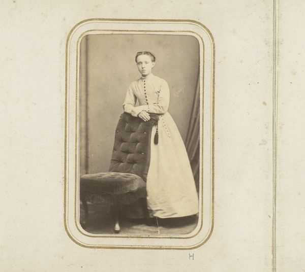 This is a portrait of a young woman leaning on a chair, created by P. Vlaanderen & C. van der Aa. Portraits like these offer a window into the rigid social structures of the time. In the 19th century, strict gender roles confined women to the domestic sphere, often limiting their opportunities for education and personal expression. The woman's reserved posture and subdued gaze may reflect the societal expectations placed upon women to be modest and demure. Yet, there's a quiet strength in her eyes, a hint of defiance perhaps. Is she complying with expectations, or subtly challenging them? Consider too the artistry involved in capturing this moment. Photography was still a relatively new medium, and portraits like these were often carefully staged to convey particular messages about status and identity. This image invites us to reflect on the complex interplay between representation, identity, and social expectation.
