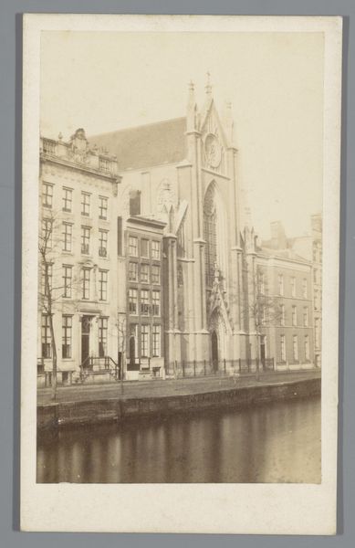 This mounted albumen print, titled 'Gezicht op De Waag te Alkmaar', captures a view of the Weigh House in Alkmaar, likely in the late 19th century by Léon & Lévy. Notice how the photograph is structured. The eye is immediately drawn to the tower. Its height and intricate detailing create a strong vertical axis. The dark and still water in the canal creates a horizontal base, and the lines of buildings on either side frame the central structure. The photograph uses tonal variation to create depth. The light reflecting off the water and the soft gradations in the sky create a sense of atmospheric perspective. Consider the interplay between light and shadow. The building's details are brought to life by the way light models its form, creating depth and texture. The structural clarity and careful arrangement invite us to consider the photograph not just as a record, but as a constructed image. A dialogue between form and representation.