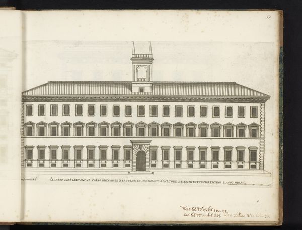 Curator: This detailed engraving by Giovanni Battista Falda, dating from after 1655, depicts the Façade van Palazzo Altemps. It’s rendered meticulously on paper, using line techniques that showcase the architectural details. Editor: My first thought is order, almost to the point of being clinical. The relentless repetition of the windows, the unwavering lines – it's a monument to…well, what? Curator: Consider the function of such an image. Falda was documenting Roman palaces. This isn’t just art; it’s a record, a reproducible representation intended for circulation. Think about the labor involved in creating the copperplate for the engraving, the multiple impressions pulled, and how those images then traveled, disseminating ideas about architectural design. Editor: Yes, and who was consuming these images? Likely, wealthy patrons, aspiring architects. So this isn’t just about the “how,” but the “who.” Who gets to dictate architectural style, who gets to live in these spaces? We need to interrogate the social hierarchies embedded in such seemingly neutral representations. Curator: Absolutely, the Baroque style itself speaks to the power and opulence of the elite. Look at the way the facade is presented, so clean and balanced. Falda focuses intently on the building’s frontage and neglects to show its position in the Roman street. Editor: And what message does that aesthetic choice send? Erasing the chaos and dirt of everyday life to project an image of serene power? The Palazzo Altemps itself has a complex history, its ownership shifting through various noble families, each leaving their mark. This façade becomes a contested space of power and identity. Curator: The choice of engraving itself as a medium matters, because it allowed architectural information to circulate with unprecedented scale and relative efficiency. It connects directly to both design and the economic context of artistic consumption and display. Editor: Which begs the question: what are the politics of elevation inherent in depicting architecture? How does the image of the palazzo solidify its power in relation to other marginalized people and places? What labor forces created it, what purpose does this power structure serve in a city. Curator: Well, this exploration of process helps deepen our appreciation. Considering the Palazzo not just as a static monument, but as the product of complex social and material forces offers a far richer engagement. Editor: Precisely. It challenges us to think critically about the power dynamics embedded in visual representation and material production that go far beyond architecture.