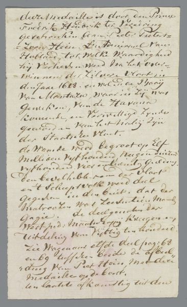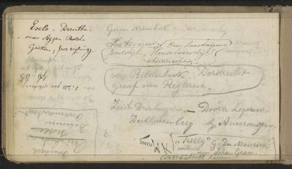 Curator: This delicate work, "Namen van militairen uit Hannover," created between 1845 and 1848 by Christian Heinrich Gottlieb Steuerwald, offers an interesting intersection between art and document. My initial impression is how the handwritten script creates a sort of abstract texture. Editor: Texture indeed, and one born of labor and a very specific material process! It seems a rather functional object, rendered in ink and pencil on paper. I am curious about the nature of that paper; is it machine-made or laid? What type of inks are used and how would each affect the strokes? These decisions shape how the names are presented. Curator: The linear progression and deliberate spacing give a structure— almost like stanzas of a poem, which provides each name and rank its own unique weight. And I love how "Vive le Shrapnells" interrupts the otherwise linear flow. Its jaunty slant breaks the predictable rhythm. Editor: Yes, consider the context— this paper records military names, a clear function! The very act of inscription reflects institutional power, the bureaucracy of warfare even. It speaks volumes about labor: the hand that writes and those whose names are written down as they are managed as material resources in the service of state power. Curator: You are drawn to its role as record, I concede. Yet look at Steuerwald's compositional choices— the elegant flourish of some names contrasted against others, the way the weight of the ink varies, providing contrast. It's clear aesthetic consideration has been employed in organizing this record. We shouldn't dismiss Steuerwald's artful deployment of elements. Editor: True. While aesthetics play a role, understanding its context helps illuminate its broader commentary about labour. These names signify men subject to conscription; it’s a tangible link to social reality of its time, the intersection of military power and lives. It reminds us that artistic choices are intertwined with tangible lives, societal structures, and, yes, even the military apparatus! Curator: Your points bring to light how embedded such forms were with the broader political environment. This artwork prompts one to dig into history and appreciate how individual choices create new avenues for thinking. Editor: Ultimately, the record encourages considering how we assign aesthetic meaning even when functionality seemingly dominates. Examining "Namen van militairen uit Hannover," helps reveal the complex materiality intertwined with social inscription.
