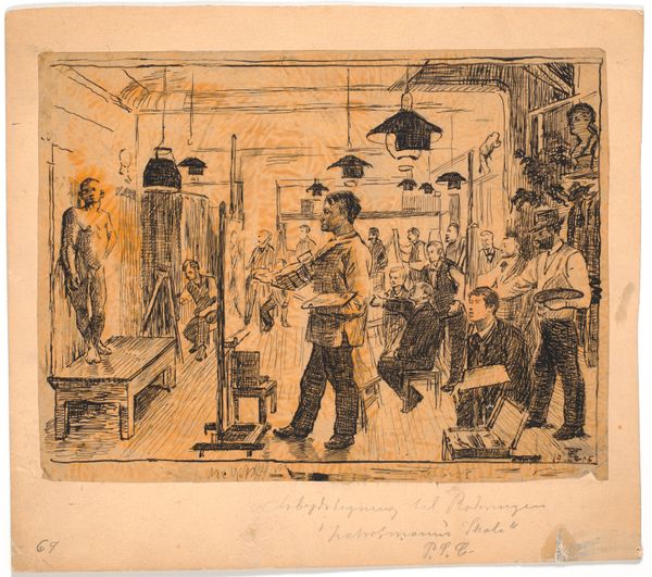 Curator: What a tender, almost dreamlike scene. Looking at Boccioni's Study for "Homage to Mother," created around 1907, you feel immediately drawn to the intimacy within these sketched panels. Editor: Yes, there’s a quietude, a feeling of being in observation. It feels very personal. Each vignette presents the subject, potentially Boccioni's mother, within enclosed domestic scenes. What social structures inform the emotional texture we find within the family, in Boccioni's Italy? Curator: Exactly, considering Boccioni’s Futurism is crucial, especially given Futurism’s complex and often contradictory relationship to women and the domestic space. This drawing, housed at the Met, predates his full embrace of Futurism, yet we can see his move toward simplifying forms and emphasizing modern life's experiences. Note the composition into three distinct spaces that might signal temporality and movement - typical Futurist concerns. Editor: Indeed, although these distinct spaces are unified with common forms that do not clearly distinguish subject from context. Considering its historical moment, the pre-war period, do we see the dawn of those futurist ideas starting to take hold in the way that labor is displayed or the way that community is presented? Boccioni clearly isolates and confines these feminine roles into enclosed, controlled areas. Curator: He uses light masterfully, and it influences how we, as viewers, engage in what you termed labor: note the person bent over a book or those gathered together sewing. Editor: Which can speak directly to the politics of labour and class distinctions. Who is given the leisure for academic study and who performs manual labor? And how does gender inform those divides? Even without color, the textures he suggests make this question linger with its stark lines. Curator: And it lingers perhaps because he isn't fully committed, because this is still a study. But perhaps that very quality allows us to examine the layers you uncover here without being overshadowed by his later ideological declarations. Editor: Yes, it functions almost as a palimpsest of nascent ideas around gender and modernity and community. Curator: A generous invitation into those ever present, very powerful themes in life and in art. Editor: An insight that resonates as much today as it did then, if not more.