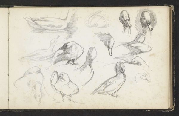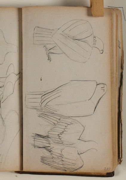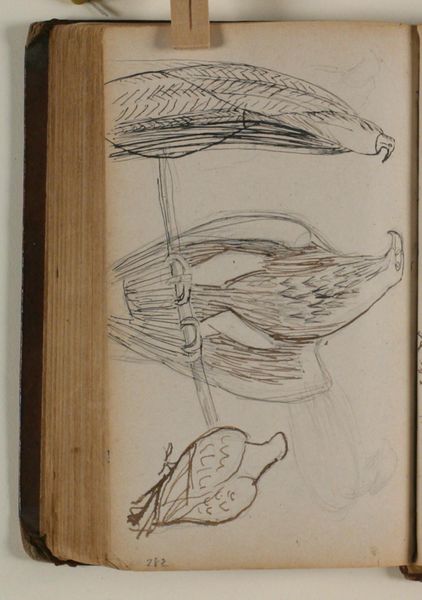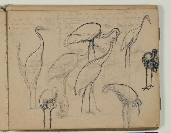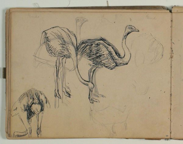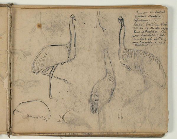 Editor: This is Niels Larsen Stevns' drawing, "Skeletter af kat og fugl," made sometime between 1864 and 1941 using pencil and colored pencil on paper. It's striking how vulnerable these creatures appear in skeletal form. What symbolic meaning do you think these animals held for Stevns? Curator: Looking at these carefully rendered skeletons, I am drawn to the persistent symbolism they represent. We instinctively interpret a skeleton as representing mortality, the end, but consider how pervasive animal symbols are in folklore. Editor: So you think that seeing both as skeletons helps us consider that? Curator: Precisely. Here we see the Cat – its skeleton a symbol, since Medieval times, associated with both domesticity and wild independence – contrasted with that of the Bird, frequently representing freedom, the soul’s journey, spiritual transcendence. How does that symbolism manifest when presented this way? Editor: So stripping them down to their skeletal forms… kind of equalizes them? It emphasizes their shared mortality, but maybe also strips away their symbolic power. Curator: A compelling point. Are we confronting vanitas symbols reminding us of life's brevity? Or does it push us toward broader concepts – the delicate balance within nature's food chain, a memento mori for our era? Or could these precise, anatomical drawings simply speak of scientific inquiry, rather than emotional reflection? Editor: I hadn't considered that. I was so caught up in the emotional reading of the piece. Curator: Symbols evolve, shift meanings based on who is looking, when they look, and *where*. Always keep an eye out. Editor: I will, thank you! This really shed some light on what could have been simple scientific study.