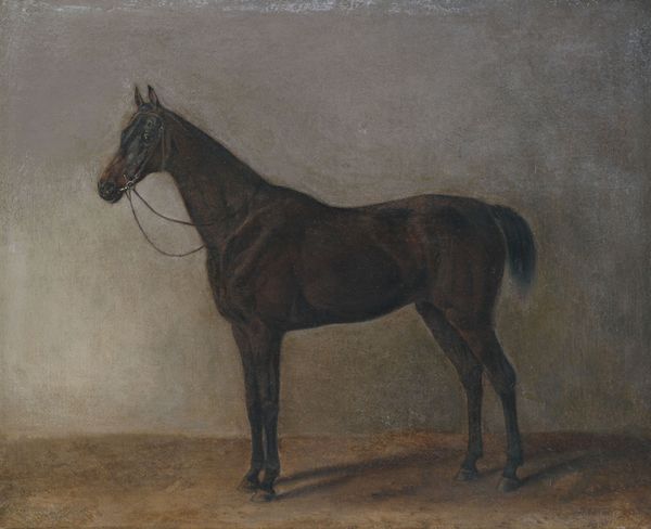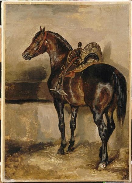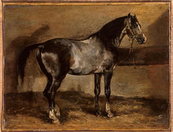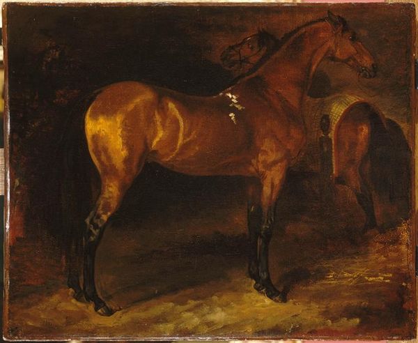 Curator: The work before us, "Cheval brun à l’écurie", was completed around 1818 by Théodore Géricault. The medium is oil on canvas. Editor: It’s striking how Géricault captures the horse’s stillness. There's a kind of heavy resignation in the animal's posture. You feel the weight of the stable and perhaps its circumstances. Curator: Considering Géricault’s social milieu and interest in the marginal, one can't help but consider what this "animal portrait" says about power dynamics within society at that moment. Is he humanizing the horse, drawing parallels between its constrained existence and certain human conditions? The art world certainly evolved since animals were first portrayed, especially in their association to class status. Editor: Absolutely. The horse as a symbol is so loaded. Traditionally a marker of wealth and nobility, here the animal is confined. I am also drawn to its stark representation. The raw brushstrokes speak to a break from academic idealism. The piece presents the unvarnished reality. Curator: Precisely. It marks the shift toward Realism within Romanticism. Note that even as the artistic academies upheld historical or mythological narratives, paintings of animals gave a means of questioning it, which allowed new political interpretations, even when depicting something as seemingly banal as this domesticated animal in its stable. Editor: Thinking about that intersection between artistic tradition and socio-political commentary really deepens my understanding. I Initially saw a straightforward depiction of an animal but now recognize an element of criticism. It allows to challenge perceptions about what deserves artistic attention and what defines beauty. Curator: And to continue those modern debates concerning the status of beings, questioning the political as well as the personal value of other lives around us, expanding to race, gender, class and species... Editor: This reflection underscores the ability of art to stimulate reflection and push viewers to see things beyond the aesthetic realm and, thus, transform one's comprehension. Curator: It allows, beyond immediate perceptions, to challenge entrenched assumptions of the world order that often dictate aesthetic judgments and social stratification. Editor: Precisely!