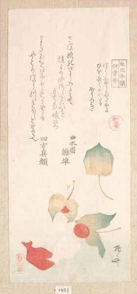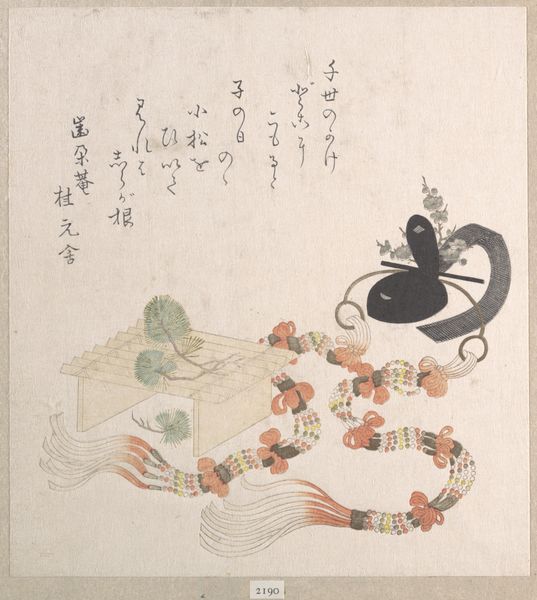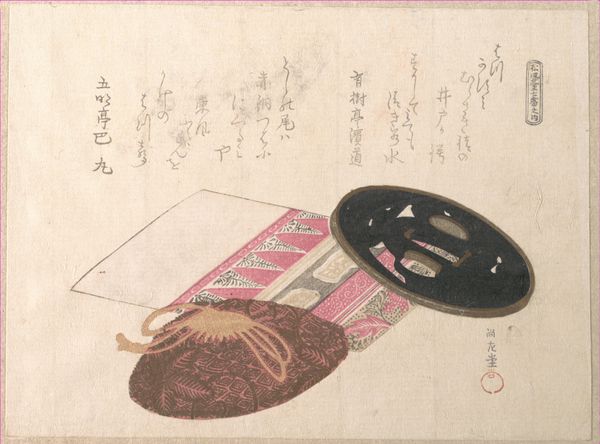 Curator: Immediately, what strikes me is the muted color palette—almost as if this lute is dreaming in sepia tones. Editor: And dreaming, perhaps, of a world of beauty and elegance. What we are looking at is a woodblock print called "Biwa (Japanese Lute) with Cover" from the 19th century, made in the style of Kubo Shunman. Curator: Oh, it’s utterly precious! So delicate you almost want to whisper around it. And yet there is something so serene about this still life that one does not associate to the sound a lute might produce! Editor: Right, Shunman positions it within the 'ukiyo-e' tradition, which elevates ephemeral pleasures and leisure to artistic merit, despite a turbulent history that challenged oppressive societal norms. This form emerged during the Edo period in Japan. Curator: The pattern on the cover, too, seems so intentionally elaborate against the lute itself; almost mocking in its abundance. Like the cover might be more impressive than the lute it shields? What do you think about that bold compositional element? Editor: Absolutely. The cover not only protects but almost adorns the instrument, adding to its aura of elegance. Think about the samurai class during that period, though. Shunman critiques systems where individual talent, the music of the lute, is obscured by wealth and status. Curator: I love how you interpret the lute that way! This perspective shifts it away from being only a beautiful decorative thing—and this encourages me to read the poem scribbled in the corner. It feels melancholic to look at it but what could the story there be about, hidden in translation? Editor: Considering the references to spring and fragrance within that traditional waka poem and given Shunman's critical awareness, I interpret the contrast to say more of life's ephemeral beauty but also of missed opportunity and a critical engagement with wealth and the feudal elite. Curator: To think about how the world sounds… muffled in opportunity. Thanks for opening my ears! Editor: Likewise. It's crucial to remember how art both reflects and resists the forces of its time. Hopefully our conversation inspires future reflection too.