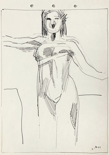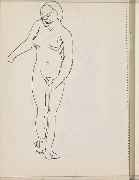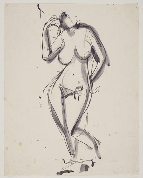 Othon Friesz made this quick sketch of a standing woman with arms overhead, using graphite on paper. It feels like a study, a way of working out the figure's pose, with lines that are quick and searching. The graphite is applied with varying pressure, creating a sense of depth and volume with just a few strokes. Look at the torso—the lines are confident, almost bold, yet they remain open, allowing the form to breathe. There's an energy in the sketch, a sense of the artist's hand moving rapidly across the page. The legs almost don't resolve. This reminds me of Matisse, in how he could suggest so much with so little. But Friesz has his own sensibility, a kind of raw directness that I find really appealing. It's like he's inviting us into his process, showing us the messy, imperfect beauty of making art. And that's something I can always appreciate.