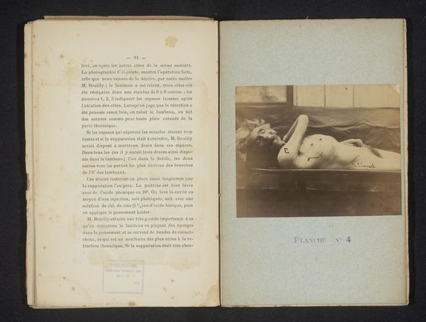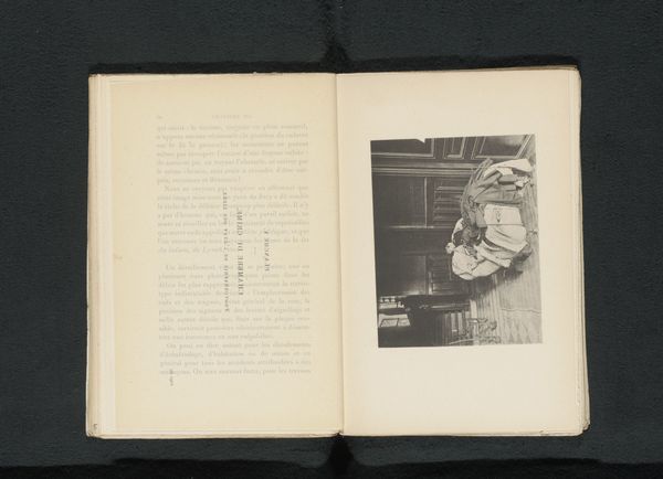Curator: This haunting gelatin silver print, titled "Christus ligt dood opgebaard, met een vrouw aan zijn voeten," or "Christ Lies Dead, with a Woman at his Feet" by Léon Bovier, dates from before 1901. Editor: My immediate impression is of stillness and immense sadness. The monochromatic palette amplifies the somber mood. Curator: Indeed. Considering the late 19th-century context, such a stark and intimate depiction challenges established artistic conventions and ideals around the representation of death, the female figure and religious scenes. It prompts questions regarding who is being memorialized, and who is positioned to grieve whom. Editor: Absolutely. I see it playing with archetypal images of mourning. The body laid out echoes traditional depictions of Christ after the crucifixion, invoking centuries of visual vocabulary connected to sacrifice, loss, and, perhaps, redemption. Yet, the intimacy of the presentation, in photographic print, adds another layer. It lacks the heroic scale of paintings on similar topics. Curator: Precisely! It’s a visual study of both death and gender, that resists simplistic readings. Bovier doesn’t idealize the female figure’s grief but situates it as part of the broader socio-political context where women were excluded from positions of power but instrumental to expressions of community and social belonging. The scene invokes broader debates on gendered access to visibility, historical memorialization, and participation within religious communities. Editor: The photograph’s muted tones highlight texture and line, intensifying its emotional resonance, which, for me, is a subtle exploration of sacred and profane merging within visual cultures. Curator: It is fascinating how it subverts religious representation by inviting discussions around grief, marginalization, and visibility in art history. Editor: A quietly powerful statement, indeed. The way Bovier frames this somber moment stays with me, even after looking away.