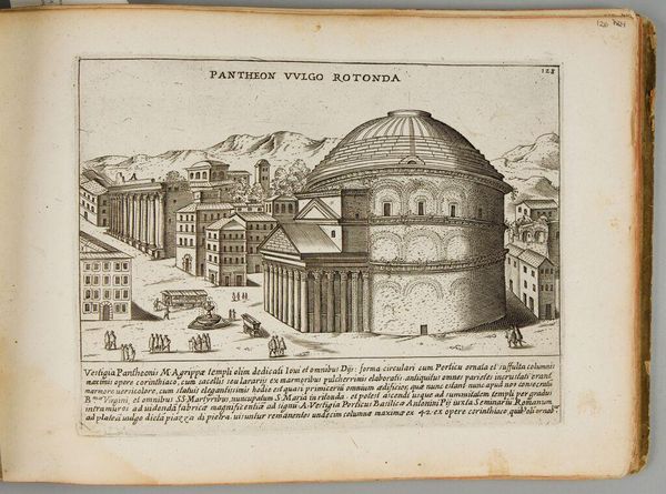 Curator: This engraving by Giacomo Lauro depicts the Pantheon in Rome. The print itself measures about 18 by 23 centimeters. Editor: It appears so precise, almost like a technical drawing, yet there's an undeniable sense of grandeur. The Pantheon dominates, of course. Curator: Considering this was likely created for wider circulation, the engraving process itself – the labor involved in producing these lines, the ink, the paper – would have been a significant undertaking. Editor: The Pantheon, even in this depiction, continues to function as a powerful symbol. The oculus invites meditation on the divine. Curator: Yes, the deliberate rendering – the choice to highlight certain architectural elements – speaks to the function of this print as a tool for dissemination and knowledge. Editor: It's a document of an ideal, a memory palace rendered in monochrome. I can almost feel the weight of history looking at those etched lines. Curator: I agree. It's a testament to how artistic reproduction shaped the perception of these grand structures for wider audiences. Editor: Ultimately, this image transports us through time, echoing the symbolic weight of antiquity.