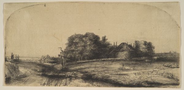 This is Landscape with a Hay Barn and a Flock of Sheep by Rembrandt van Rijn, an etching rendered on a sheet of paper. Immediately, the composition draws us into its open simplicity, where the artist uses dark and light contrasts to evoke a feeling of calm. The landscape is structured with a rhythmic play of lines and shapes. Look at how Rembrandt uses varied etching strokes—some firm, others light—to define forms like the barn, trees, and the subtle movements of the sheep. Semiotically, the hay barn and the sheep could be interpreted as signs of pastoral life, representing themes of nature and simplicity. Rembrandt's intentional use of chiaroscuro – the interplay between light and dark – enhances the textures and forms, which may destabilize established meanings. The open, undefined sky contrasts with the detailed foreground, pushing us to think about the relationships between the finite and infinite. How does the structure guide your eye through the scene, and what meanings might you derive from its detailed and yet unresolved elements?