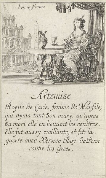 Editor: Here we have "Euadne," an etching by Stefano della Bella, created sometime between 1620 and 1664. It depicts a woman stepping into a large fire. I’m immediately struck by the intensity of the scene; it’s a really dramatic moment, full of sorrow and, oddly, resolve. What emotions or narratives do you see playing out here? Curator: Oh, my dear, I see a swan song, a heart's fiery whisper. The crisp lines of the etching, they don't just show us a scene; they hint at the tumultuous Baroque spirit – think drama, think passion, and maybe just a dash of the absurd. Look at Euadne, practically dancing into that inferno! It’s operatic, isn't it? Editor: Absolutely, operatic is a great way to describe it. But isn’t there something unsettling about the elegance, given the context? Curator: Ah, that delicious tension is the Bella’s special sauce, isn’t it? See, he hands you tragedy on a silver platter, all exquisitely detailed flames and graceful posture. We know she is walking into a burning pyre after her husband’s death, which makes the ‘bonne femme’ inscription even more heartbreaking and a bit ironic, really. But does that elegance somehow *cheapen* the grief? Or does it elevate her devotion? I think both can be true simultaneously! Editor: I think I get that – it makes you consider the different ways of facing grief. Curator: Precisely! This tiny etching is an invitation to imagine an ocean of conflicting feelings… plus, the delicious scent of woodsmoke, maybe? No? Just me? Anyway, isn't that so Baroque? Editor: It's definitely more complex than I initially thought. I’ll look at Baroque art a bit differently now. Thanks! Curator: My sweet child, that's the spark. Fan that flame, now!