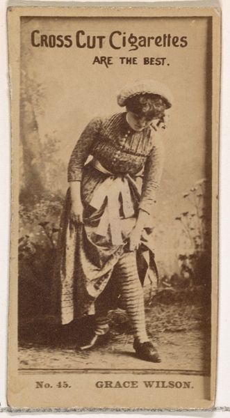This is a photograph of Gracie Wilson, an actress, created by Allen & Ginter as part of a series for Virginia Brights Cigarettes. Gracie's attire includes striped stockings, a detail that is especially striking. The exposure of these stockings is a deliberate act, raising her skirt to reveal them. Consider the cultural context, where such displays were charged with meaning. Similar motifs of partial undress appear throughout art history. Think of the playful nymphs in classical paintings or even the veiled figures in Renaissance art; these images toy with the idea of concealment and revelation. This careful unveiling speaks to a deeper psychological dance. It plays on our fascination with the forbidden, tapping into primal desires and anxieties surrounding exposure. The image, though simple, becomes a powerful force, engaging viewers on a deep, subconscious level. This symbol has resurfaced, evolved, and taken on new meanings in different historical contexts.