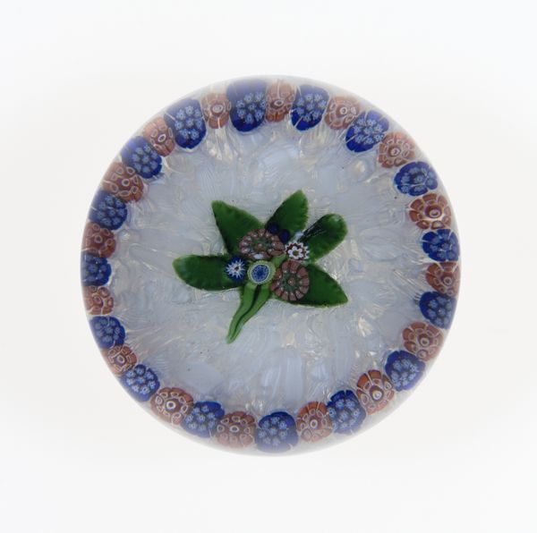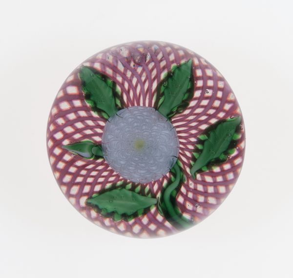 Curator: This delicate glass paperweight, attributed to the Compagnie de Saint Louis and dating roughly between 1845 and 1860, presents a fascinating window into decorative arts of the period. It resides here at the Art Institute of Chicago. Editor: My first impression is just how comforting the object feels. The perfect symmetry and encased floral bouquet impart a feeling of quiet contemplation. Like a captured moment of a perfect garden. Curator: Indeed. The 'thousand flower' or millefiori technique involved creating complex glass canes which were then sliced and arranged. Laborious work went into the construction of those canes; then even more skill to assemble the imagery under the glass dome. Consider the specific social role, too; paperweights gain popularity with growing bureaucracies that handled huge volumes of paper. Editor: And the flower symbolism cannot be overlooked. Encased in glass, each miniature bloom takes on a preserved significance, a suggestion of fragility and eternity held in balance. The choice of particular flower types would've carried messages relevant to the recipient, layered meanings now partially lost to time. It echoes sentimental floral jewellery which saw a resurgence at this time. Curator: Precisely. The art and craft is undeniably French, appealing to a desire for both decoration and functionality among the bourgeoisie. The rise of such luxury objects speaks volumes about class aspirations and accessibility afforded by industrial advancements. Also interesting to consider, how something intended to anchor, actually seems to uplift the spirit. Editor: I agree. I’m struck, looking at it now, by the contradiction between the weight, and the lightness of the floral design. It's a miniature world offering us reflection, holding both material presence and symbolic depth. Curator: It brings a unique perspective to the complex intersection of craft, utility, and social expression during that era, wouldn't you say? Editor: Definitely, and how lovely to dwell for a moment within this enchanting encapsulation of meaning and history.