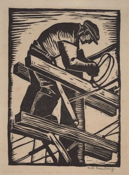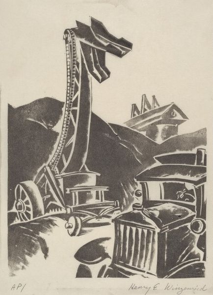 Curator: Let's turn our attention to "The Workers (No. I)", a woodcut print created by Charles Turzak around the 1930s. What are your immediate impressions? Editor: Stark. The high-contrast black and white immediately evokes a sense of drama. The sharp geometric lines of the industrial background almost threaten to overwhelm the figures in the foreground. Curator: Indeed. The print reflects the era’s focus on the working class and labor movements, aligning with the principles of social realism. It presents a powerful commentary on worker’s rights during a period marked by significant economic disparity. We must ask ourselves: who are these workers and what socioeconomic conditions produced them? Editor: Semiotically, it’s fascinating. The composition draws the eye upward from the workers clustered around their educational material to the colossal factory structures, suggesting their relationship with industry, but there is also a star, almost as a guiding beacon. How are we meant to understand the semiotic relation between labour and aspiration? Curator: Precisely. The "Workers Education" material these men are reading directly references attempts by leftist organizations to empower the proletariat through intellectual and social enlightenment. Turzak makes us confront the dynamics of class struggle and knowledge. It’s essential we analyze how it perpetuates or critiques prevailing notions about power and collective action. Editor: While understanding this context undoubtedly enriches the piece, one could also view it more abstractly through the bold lines and form itself. It feels… weighty. A meditation on the burden and importance of industry itself, which has become so visually striking in itself due to the woodcut medium used to execute it. The geometric forms of the buildings give an impression of towering architecture, imposing the importance of manufacturing and architectural prowess above the daily life. Curator: I appreciate how the formal elements contribute to its narrative weight. It encapsulates the urgency and resilience of the era while inviting us to confront unresolved inequities in contemporary society. The scale feels grand despite its small form. It is a window into a past that persists in many ways. Editor: It is as though Turzak has captured, within the graphic strength of his woodcut, a fundamental truth, the tensions that we can feel visually regardless of the immediate themes, from a distant vantage point and current one.