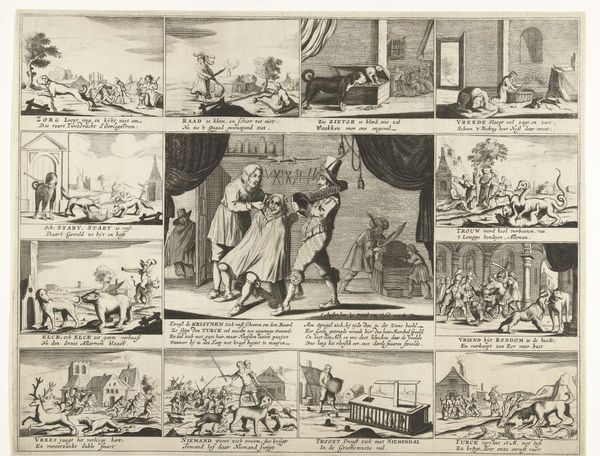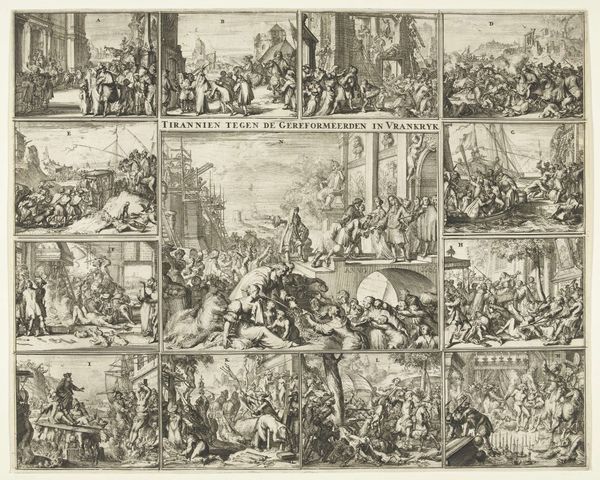 Editor: This etching, "Wreedheden jegens de Ierse protestanten, 1642," depicts various acts of violence. The piece, created between 1641 and 1642, is stark, especially with its monochrome palette. How does its historical context influence how we should interpret it? Curator: Given the inflammatory nature of the subject matter, the historical context is critical. This print reflects a very specific, and likely biased, narrative of the Irish Rebellion of 1641. It aims to depict atrocities committed against Protestant settlers, furthering a particular political agenda and shaping public opinion. Notice how the artist groups and labels each scene? What effect does that have on the viewer? Editor: The labels give a sense of documentary evidence, even though the images are clearly dramatized. It's like a series of accusations presented as fact. Do you think the artist was trying to create a sense of moral outrage? Curator: Absolutely. These prints were often circulated as propaganda. Consider who might have commissioned it, who the intended audience was, and what their motivations were. These images served to dehumanize the Irish Catholics and legitimize further violence and oppression. Do you think seeing something like this displayed in the Rijksmuseum changes the intention from the original historical intent? Editor: I think putting it in a museum gives us space to examine it critically, to think about the dangers of propaganda and the way history can be manipulated through art. Seeing it today, hopefully, we analyze it instead of just internalizing a message of hate. Curator: Precisely. The museum context transforms it into a historical artifact that we can study, contextualize, and learn from, even as we acknowledge its problematic origins. Editor: That’s a great point. Thanks for sharing your insight!