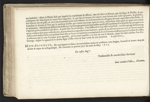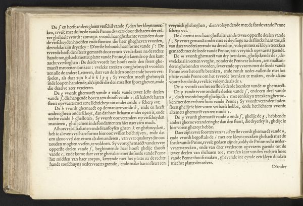 Curator: Here, adorning the walls of the Rijksmuseum, is "Instructie bij het schrijven van de Nederlandse letteren (zesde vervolg) en een kort bericht van de lopende handen," a typographical print crafted in 1605 by Jan van de Velde I. Editor: My initial sense is one of calm. Even though I cannot read it, the text has an undeniable aesthetic quality; I feel strangely soothed by the even, ordered arrangement of these inky symbols. Curator: This piece provides instruction in writing Dutch script, as the rather lengthy title implies! Van de Velde details techniques and offers observations about the forms and connections within lettering. Editor: The loops and lines have a mesmerizing quality. Looking closely, it’s apparent how systematically each stroke must have been laid down, like rows of dark crops furrowed upon parchment. There is beauty here. Curator: Absolutely, he approaches typography with both precision and artistry. The print uses ink on paper and showcases both drawing and printmaking techniques to explore Dutch Golden Age calligraphy. Note the "Kort bericht vande loopende banden" passage and initial drop cap. Editor: You see how some passages appear denser and darker than others. Perhaps that’s emphasizing crucial principles—the "principal letters" needed to attain that 'perfectie vant vvel schrijven,' as written in the main block, to make perfection when writing! There is clear joy and love for lettering within it. Curator: It does communicate passion and erudition. The writing seems to aspire not just to instruction, but also to something elevated: encouraging practitioners to envision perfections. Editor: So we could say the image shows precision meeting flair, intellect meeting passion, function with beauty: elements bound tightly like the artist’s recommended ‘tzamen-bindinge der lettere’. Curator: That's astute. Ultimately, Van de Velde transforms what could be a mere technical manual into a celebration of the art of writing itself. Editor: So let's leave with an insight that even writing about penmanship—in my best attempt to employ what I cannot perform myself—carries some creative power in it? It makes me want to scribe words immediately...