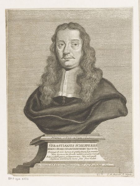 Editor: Here we have Johann Christoph Sartorius’s “Portret van Gabriel Clauder,” an engraving from sometime between 1691 and 1739. There's a stillness to this portrait, but something about the sitter’s gaze makes me wonder what he was thinking. How do you interpret this work? Curator: It's fascinating to consider this engraving as a document of power and knowledge during the Baroque period. Think about the role of portraiture in solidifying social hierarchies. What does the elaborate wig and formal attire communicate about Clauder's position within society? Also consider how the very act of creating and disseminating his image through print served to further establish his presence and authority. Editor: So, the image itself is a form of propaganda, even? Curator: Propaganda is a strong word, but not inaccurate. It depends on how we define the term. Perhaps a softer approach might define it as strategic image-making aimed at cultivating a specific persona. Notice, for instance, the inscription beneath the portrait. How might the text shape or reinforce our understanding of Gabriel Clauder? How might it dictate our access to, and comprehension of, the image? Editor: The inscription seems to emphasize his professional achievements… as if reinforcing his importance in society. But who was this for? Curator: Exactly! Who was meant to see it, and what was the intended impact? Thinking about the socio-political context of the late 17th and early 18th centuries allows us to delve into these important considerations concerning how identities are constructed and circulated. Editor: It's amazing how much a single portrait can reveal about power and status. Thanks! Curator: Indeed! And how our reading of that image remains conditioned by the social dynamics that persist in our world today.