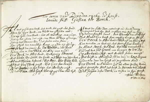 Editor: We’re looking at "Explanation of the Victory of Painting over Death (part one)," a drawing in ink on paper from around 1660 by Henrik Jordis, housed in the Rijksmuseum. The work resembles calligraphic script laid out on a page; it makes me wonder if it's the preliminary page of a manuscript or a poem. How might we interpret this artwork? Curator: Consider the era's fascination with allegory and emblem books. Jordis seems to weave text and image, a common practice. The very act of writing becomes a symbolic struggle against mortality. Don't you see the inherent duality? Editor: I can see that; it feels like he’s using the beauty of the writing itself, and references to victory to make it an ode to painting. What significance lies in using the script, the *written* word, to celebrate something visual? Curator: Ah, but writing itself carries immense visual weight! Each flourish, the density of the ink, echoes the artistry found in brushstrokes. Perhaps he is suggesting that both are forms of creation and stand in opposition to chaos and death. Are both painting and drawing united in their shared humanity and resistance against fading from the cultural memory? Editor: That's interesting; I didn't think of it that way initially. I was so focused on the visual, but it's about their unified message and lasting appeal. Curator: And in its seeming specificity, might we see a universal longing for art to outlive us all?