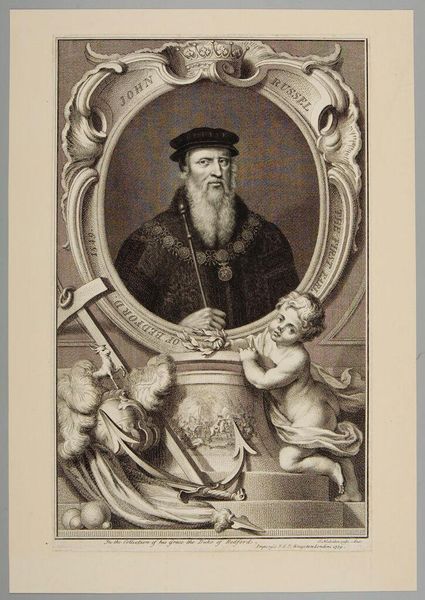 Editor: This is Jacobus Houbraken's engraving of Edward Seymour, Duke of Somerset. The detailed linework gives it a formal air, almost like a historical document. What strikes you about this portrait? Curator: It's fascinating to consider the image of power being presented here, isn't it? Look at the scene below the portrait – a royal figure, kneeling, receiving something. How does that context influence our understanding of Seymour’s portrait? Editor: It suggests a transfer of power or perhaps an act of submission. I hadn’t focused on that scene initially. Curator: Exactly. And what about the executioner’s axe at the base? Consider the implications: Power, patronage, but also the constant threat of its loss. It’s a potent reminder of the precariousness of privilege in the Tudor era. Editor: So, it's not just a portrait, but a commentary on the political climate? Curator: Precisely. It invites us to question the narratives around historical figures, and the systems of power they inhabited. Editor: That's a powerful way to view it. Thanks! Curator: My pleasure. It's always about looking beyond the surface.