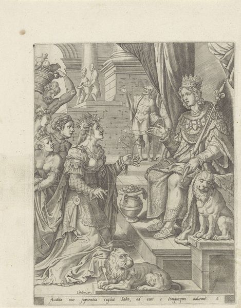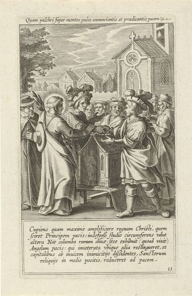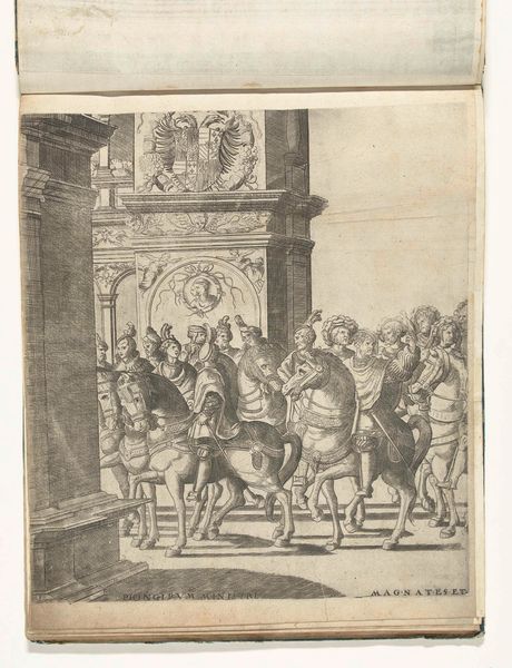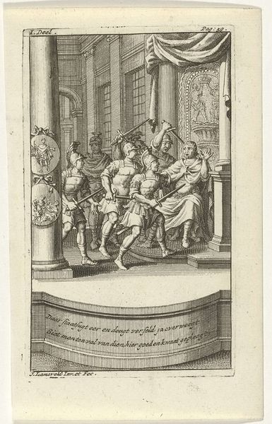 Curator: Standing before us is a piece crafted by Jan Lamsvelt in 1728, titled "Leden van de senaatspartij zijn vastberaden om Julius Caesar te doden," or, "Members of the senate party are determined to kill Julius Caesar". This artwork, residing here at the Rijksmuseum, is an engraving, allowing for its wide distribution at the time. Editor: My first impression is one of stark austerity. The monochromatic palette and rigid figures create a sense of cold determination, even a kind of chilling resolve. You can see the lack of sentiment. Curator: Exactly. The imagery is directly connected to Roman iconography – the helmets, the architecture, the emphasis on civic duty, though twisted towards violence. The figures carrying their swords high reminds us how often symbols get repurposed in political struggle. What’s being expressed here in symbolic terms goes beyond simply the murder of Caesar. Editor: I see it as a brutal critique of political ambition and betrayal, especially as the figures, while seemingly united, lack any real sense of camaraderie. Their faces seem almost identical, suggesting perhaps that their individual identities have been subsumed by their shared purpose – a very dangerous kind of conformity that facilitates violence. Are we meant to identify with the conspirators or view them with suspicion? Curator: Consider that engravings, as printed media, were crucial for disseminating particular ideas to the populace. The clean, linear style suggests a deliberate construction of this historical moment for public consumption, maybe a call for resistance against powerful individuals that goes well beyond a reading of Julius Caesar. It uses Caesar's image and memory to signal an anxiety of authority. Editor: I completely agree. Placing this print within its 18th-century context is crucial. It prompts questions about whose story is being told and why. The act of illustrating and distributing the death of Caesar, isn’t a neutral act – it becomes a political intervention reflecting Lamsvelt's agenda. The artist also clearly alludes to gender roles; the focus here is on the power of male conspiracy and dominance in Roman political history. The almost hyper-masculine performance contributes to what one may critique today as the glorification of male power. Curator: Perhaps it's about the fear of tyranny in general and this work has been placed here as a reminder for future generations. Lamsvelt taps into deeply embedded visual codes associated with heroism and treachery. Editor: Looking at it through that lens, I think that both then and now it still stands as a chilling, very gendered warning against unchecked political power and the violence enacted in its name. Curator: It certainly gives one pause. The resonance of symbols across centuries, the ease with which they can be manipulated… it’s a disquieting reflection.