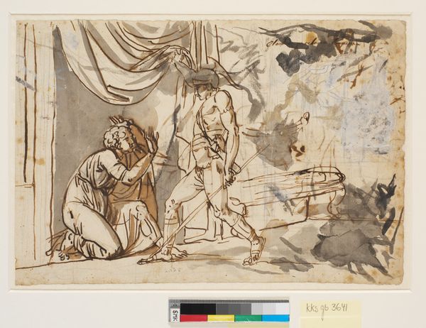 Curator: Up next, we have "Station of the Cross No. 7: 'Jesus Falls the Second Time'," a watercolor drawing dating back to around 1936, created by Beulah Bradleigh. Editor: Wow, it hits you, doesn’t it? It’s all somber muted tones, kind of oppressive, even—but the figures, though stiff, convey so much despair and exhaustion. There's something really poignant about that rawness. Curator: It’s interesting you say that, because the piece utilizes a flattened perspective— almost like a tapestry. Bradleigh separates the characters, the Roman soldiers on one side observing the torment that they have forced on the other side; on the other, you can see Christ, bearing the cross with exhaustion—the figures separated both by design and, perhaps, thematically. Editor: Yes, absolutely—it does give it a deliberate almost dream-like feeling. And the way she uses color, almost washing everything in browns and grays—except for small touches, a bit of red here and there that draws attention. There's real intent there in conveying specific emotions. What else strikes you about it formally? Curator: I'm intrigued by the composition. It's bisected, as you said, one side chaotic and full of struggle, the other still and observant behind a wall or a barrier, and there's a starkness to it—almost an echo of early Renaissance frescoes, but imbued with much more direct human emotion. Editor: I feel the muted color palette creates this weight of collective sorrow, as if the earth itself is in mourning, and you become acutely aware of all the heavy symbolism. The burden of it all. Curator: It reminds us that these stories—whether one believes in them or not—they echo through the centuries as reflections of human suffering and resilience. Editor: It feels quite present in that moment. Curator: Certainly—so thanks for joining us, as we explored this particular vision. It's a work that speaks of burdens and witness, done by a rare and visionary talent. Editor: A sobering meditation on human suffering. Something to carry with you, certainly.
