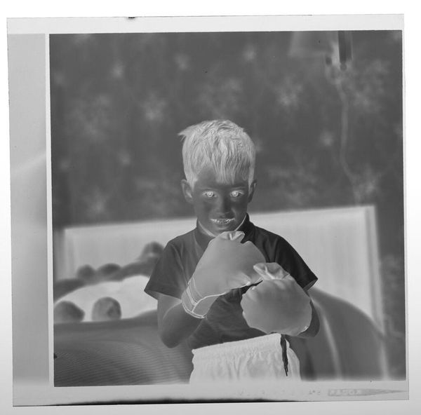 Editor: This small, undated photograph by Jack Gould, titled *Untitled (boy holding dog on vet's table)*, has such a strange mood because of the inverted contrast. What social dynamics do you see at play here? Curator: It is interesting, isn't it? This image makes me consider the power dynamics inherent in human-animal relationships, particularly within institutional settings. The boy's role is to restrain, while the vet manipulates the dog. Editor: How so? Curator: Think about the social construction of care, and who gets to decide what constitutes "care." Is this for the dog's benefit, or to normalize the dog to be more compliant in society? Editor: I never thought about it that way. I was just focusing on the boy and his dog. Curator: Exactly. And what does that say about how our society programs us to overlook the systematic oppression of some, in favor of an aestheticized vision of others? Editor: That gives me a lot to think about.