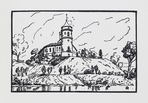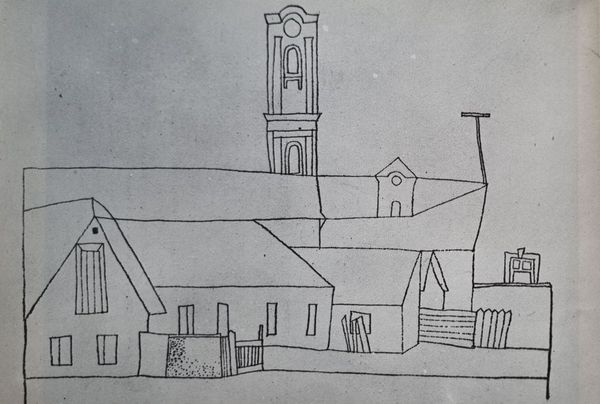 Editor: Mstislav Dobuzhinsky’s 1933 ink drawing, "Seda. Church.," presents a seemingly simple architectural landscape. But the cross atop the church, repeated on the bell tower, creates a really striking image of faith, a statement almost. What do you see in this piece? Curator: I see a layered cultural narrative. Dobuzhinsky, influenced by Modernism, uses the church and bell tower not merely as structures but as potent symbols. Notice how the linear perspective draws the eye upward, toward those crosses you mentioned. They are anchors, connecting earthly architecture with celestial aspiration. Editor: So, it's more than just a building? The church seems to almost dominate the landscape in that sense? Curator: Precisely! Churches in art often function as visual shorthand for community, history, and faith. This church, nestled within its rural setting and guarded by a humble wooden fence and populated with people in the foreground, becomes a vessel of cultural memory. Consider, too, the emotional weight of religious symbols in a landscape undergoing rapid modernization and, eventually, Soviet occupation. Do you think that might be an intended comment of resilience? Editor: It gives me something new to consider, thinking about it that way. And the bell tower being separate adds another layer, almost a call to attention outside of the main structure. I see what you mean by layers of meaning. Curator: Exactly. It’s a complex image, using seemingly simple architectural and religious imagery as symbols. Visual symbols function as cultural memory, distilling the psychological and anthropological weight of place and history into something immediately accessible. It almost begs the question - what values stand the test of time, especially during modernization or foreign regimes? Editor: It's interesting how such a straightforward drawing opens up so many avenues for interpretation when considering its cultural and historical context. Curator: Indeed! And how that straightforward quality actually emphasizes what’s culturally and historically important.