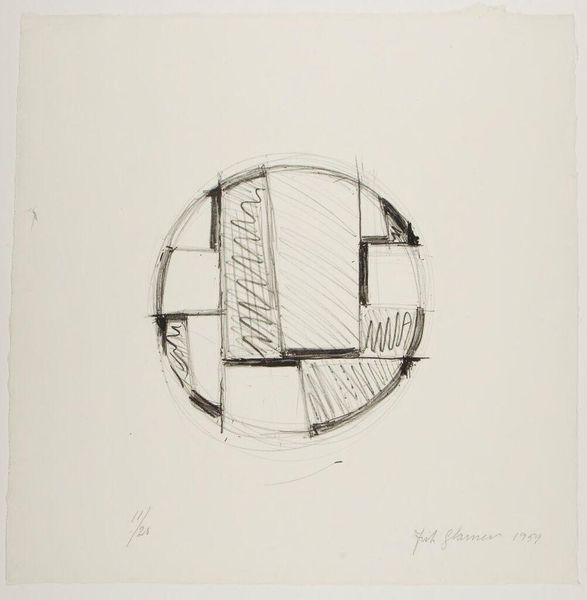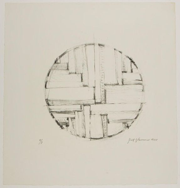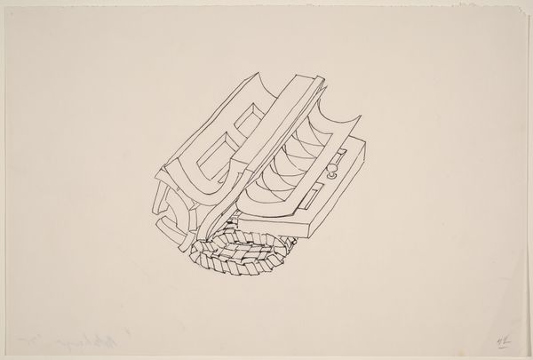 Curator: Here we have Richard Artschwager's "Basket, Table, Door, Window, Mirror, Rug #33," created in 1974. It's an ink and graphite drawing on paper. Editor: Woah, it's like looking through a kaleidoscope designed by IKEA! Flat-pack geometry with a slightly menacing precision. Curator: Artschwager's work often plays with the relationship between art and everyday objects. He blurs the lines, prompting us to reconsider what we perceive as art. Postmodernism, you know, relishing in that ambiguity. Editor: I get it. It's not about flawless representation, more about hinting at the essence of these household items, kind of pulling them apart. The lines are so clean, yet there's a definite handmade feel. Is that on purpose, a little punk rock maybe? Curator: Indeed. He's challenging the preciousness associated with high art, bringing in elements of the commonplace and the commercial. The repetition of forms also emphasizes a certain flatness, pushing back against illusionistic depth. Editor: The title is so matter-of-fact, almost like a shopping list. There's something funny about that, juxtaposed with this almost architectural arrangement. Makes you wonder if it’s poking fun at the functionalism of modern design. Curator: Precisely. By reducing these objects to their basic geometric forms, Artschwager invites us to question the social and cultural significance we attach to them. It’s about challenging the established hierarchy of visual culture. Editor: You're right, it's cheeky and kind of cool in its starkness. I like how the blank space becomes so vital; it's like the negative space is just as loud as the lines themselves. Very zen for such a busy-looking image! Curator: Ultimately, I think Artschwager pushes us to think about the environments we create for ourselves and how we define the objects within them. Editor: I agree, a funny yet unsettling meditation on the objects we surround ourselves with. Definitely given me pause on my interior design choices!