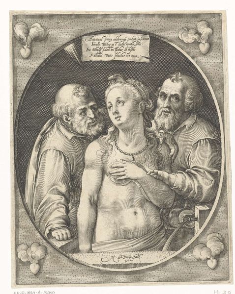 Jacob Matham created this engraving, Suzanna en de ouderlingen, around the turn of the 17th century. During this time, the Dutch Republic was experiencing significant social and religious upheaval, including a growing concern with moral issues. Here, we see Suzanna, a figure from the Book of Daniel, surprised by two elders while bathing. It is a depiction that is rife with the voyeuristic male gaze. She looks heavenward, seemingly pleading for deliverance. The elders, positioned on either side of her, embody the power dynamics at play, as they leer and reach out to her. Their actions highlight the vulnerability of Suzanna in a patriarchal society where female bodies were often subject to male control and judgment. This image speaks to the period's obsession with female virtue and the consequences of transgression. It's a stark reminder of the ways in which women's bodies have been, and continue to be, sites of cultural and moral contestation.